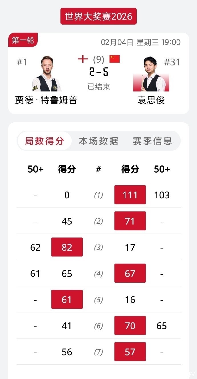 北京时辰2月5日讯息,2026年斯诺克寰宇大奖赛络续进行。第一轮第二个比赛日,赵心童、斯佳辉、英锦赛、庞俊旭4名中国选手强势晋级。其中,袁念念俊以5-2的比分爆冷淘汰寰宇第一“准度王”贾德-特鲁姆普。